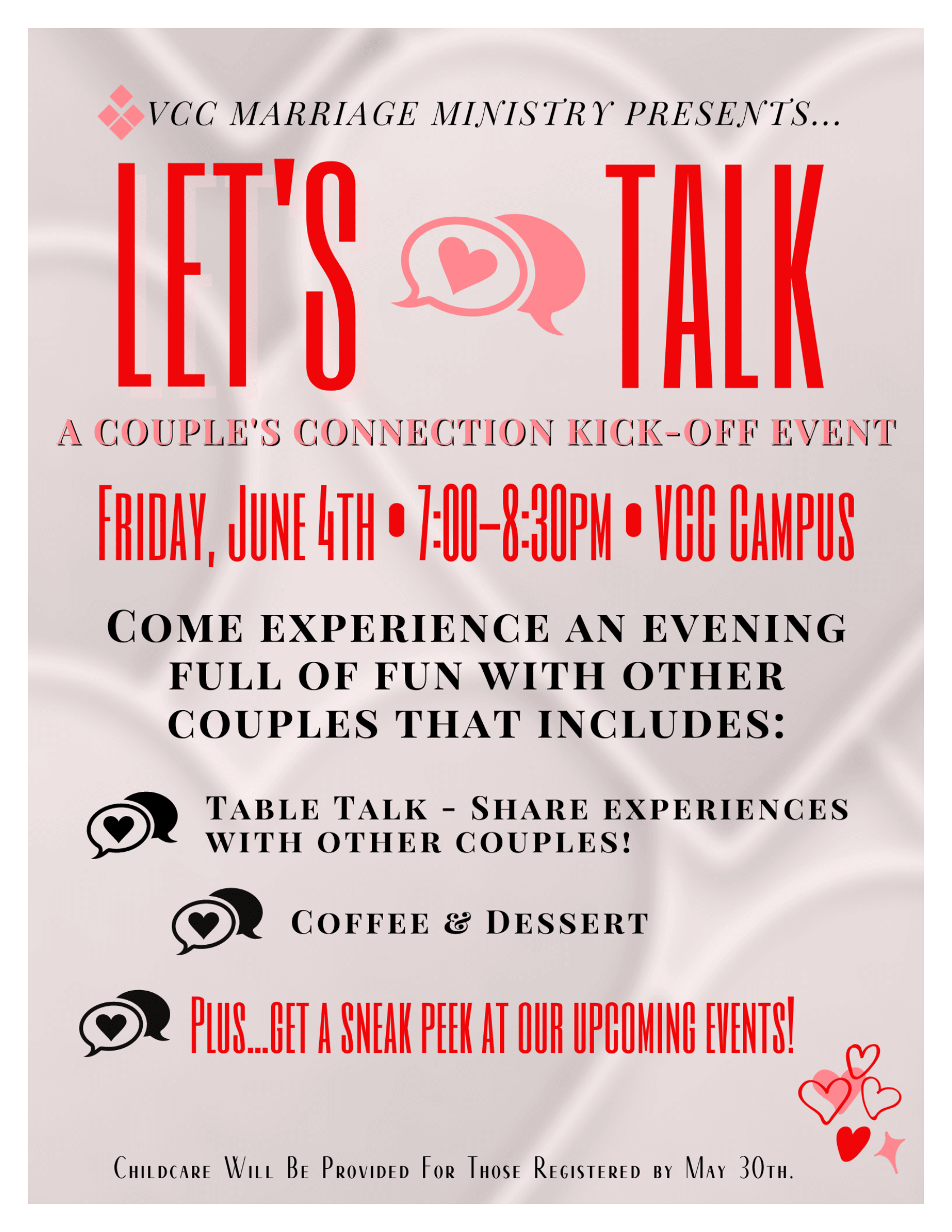 Sign up for Couple’s Connection Let’s Talk Kick-off online here: https://vccfresno.fellowshiponego.com/external/form/c3d928a6-95d3-469c-a77e-acabf99b0b3e or in the Courtyard after Sunday Service on May 23rd and May 30th.
