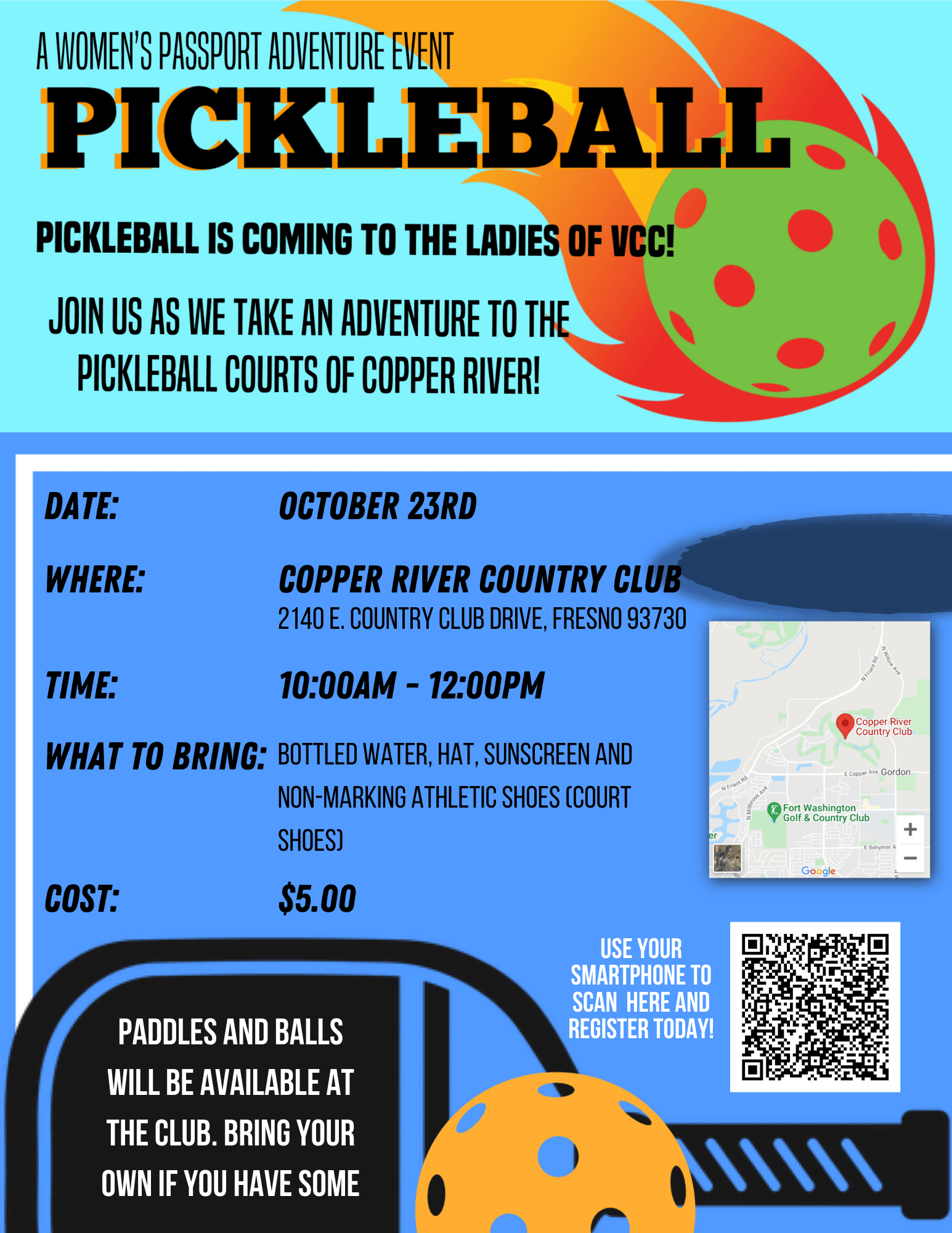 Please join us on Saturday, October 23nd from 10:00am-12:00pm for a fun adventure to the Pickleball courts of Copper River Country Club!